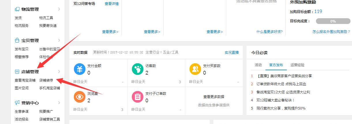 第一步:打开淘宝卖家中心,找到店铺管理,然后点击店铺装修。