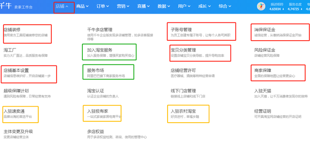 淘宝店铺开店要做的就是红色的,这个是需要在最初优化好的,绿色的是店铺开店需要购买服务软件的入口,黄色的是营运好以后发展的空间。店铺的一般应用操作。每个项目的作用一目了然,不需要花费时间去研究的。