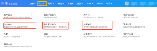 一般经常使用的是发布宝贝、体验中心、商家素材中心、详情装修。