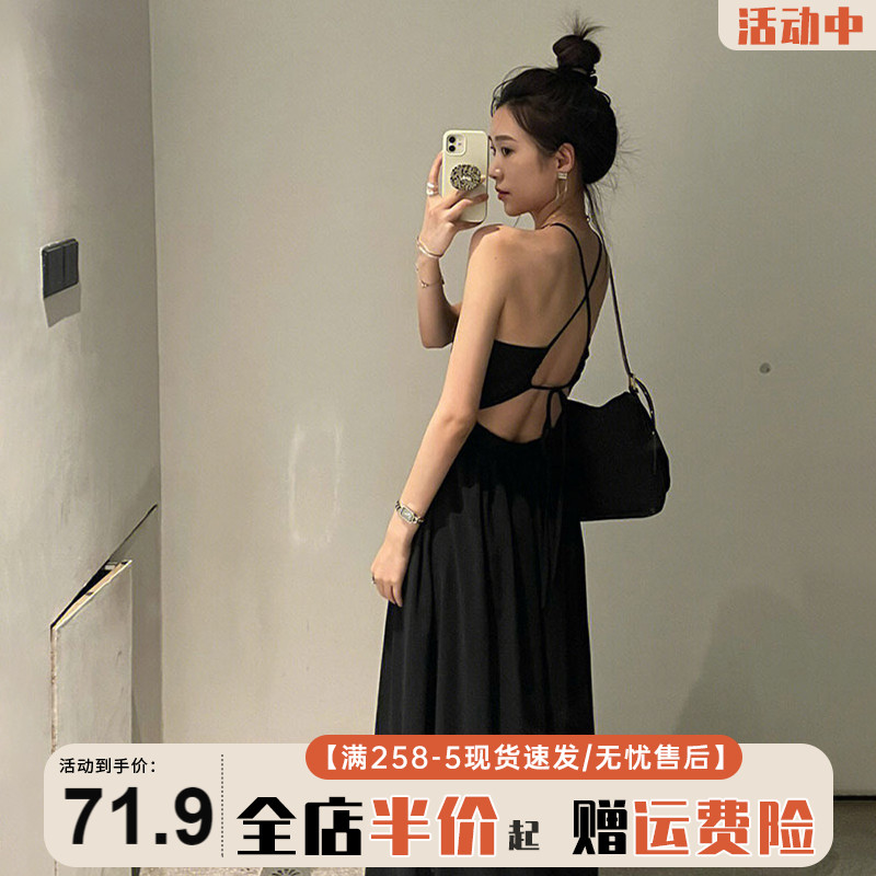 法式黑色性感辣妹露背连衣裙2023年新款夏季度假风别致独特长裙子